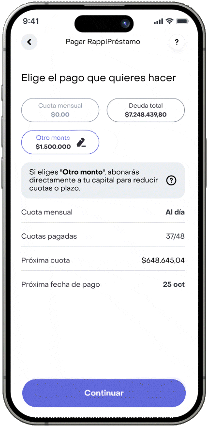 Sí, puedes realizar abonos a capital ya sea para reducir la cuota o para reducir el plazo en cualquier momento de la vida del RappiPréstamo a través de la app.