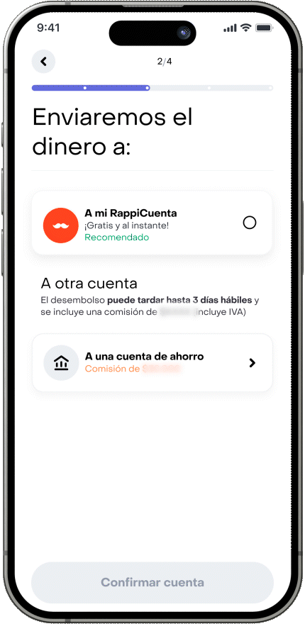 Podrás desembolsar sin ningún costo a tu RappiCuenta de forma inmediata y sin costos extras o podrás pagar una comisión y desembolsar en otro banco, teniendo en cuenta que el dinero podrá tardar hasta 72 horas hábiles.